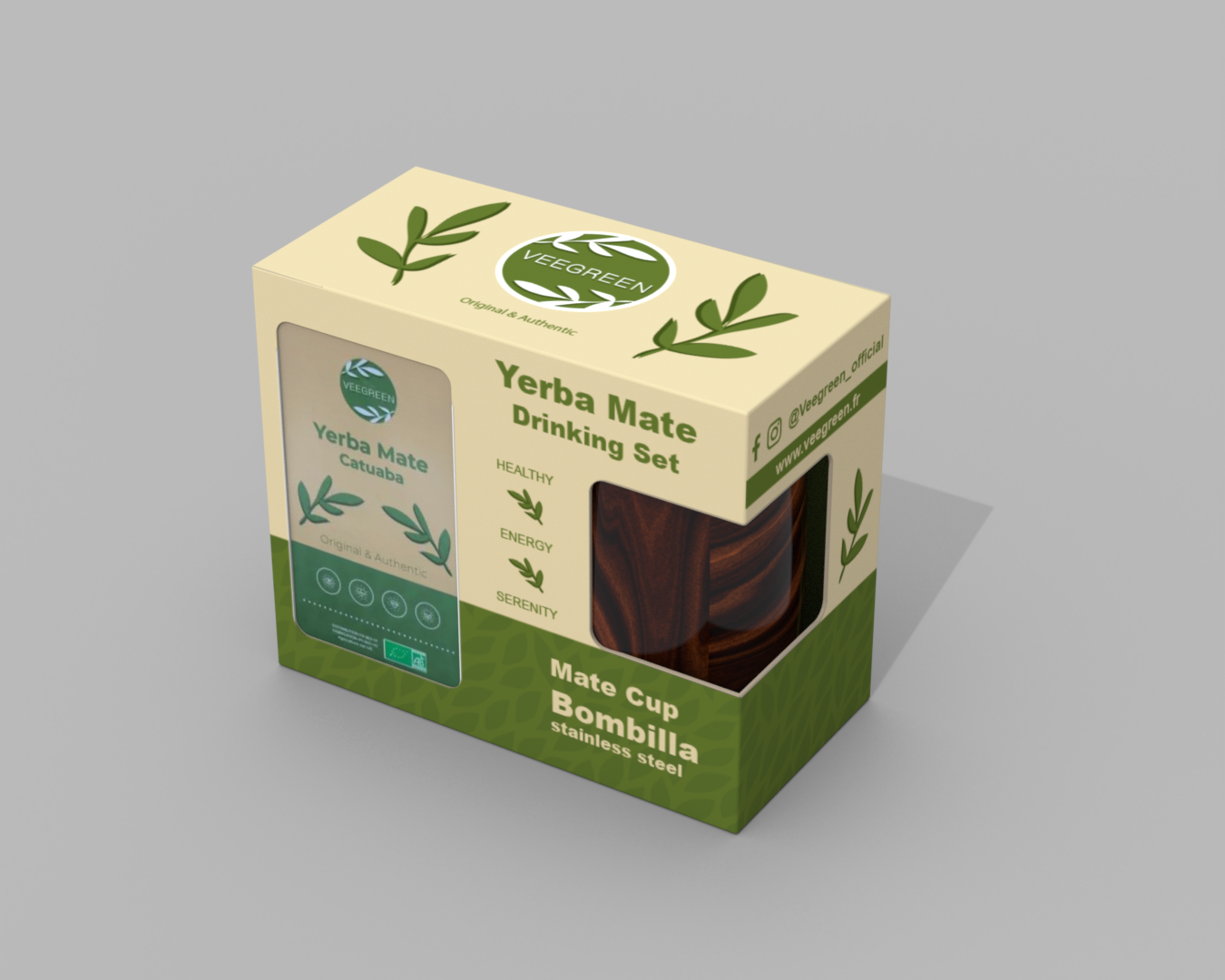 Veegreen est une marque française basée en Auvergne et spécialisée dans les produits de bien être naturels. L'entreprise m'a recontacté pour le design du packaging de leur nouveau produit : un coffret mate et la cup ainsi que la paille. Le but de ce packaging est de représenter la marque et le côté nature et bien être qu'elle prône. Mais également intégrer dans le graphisme le design du coffret Mate visible grâce à une découpe proposé et validé par le client.